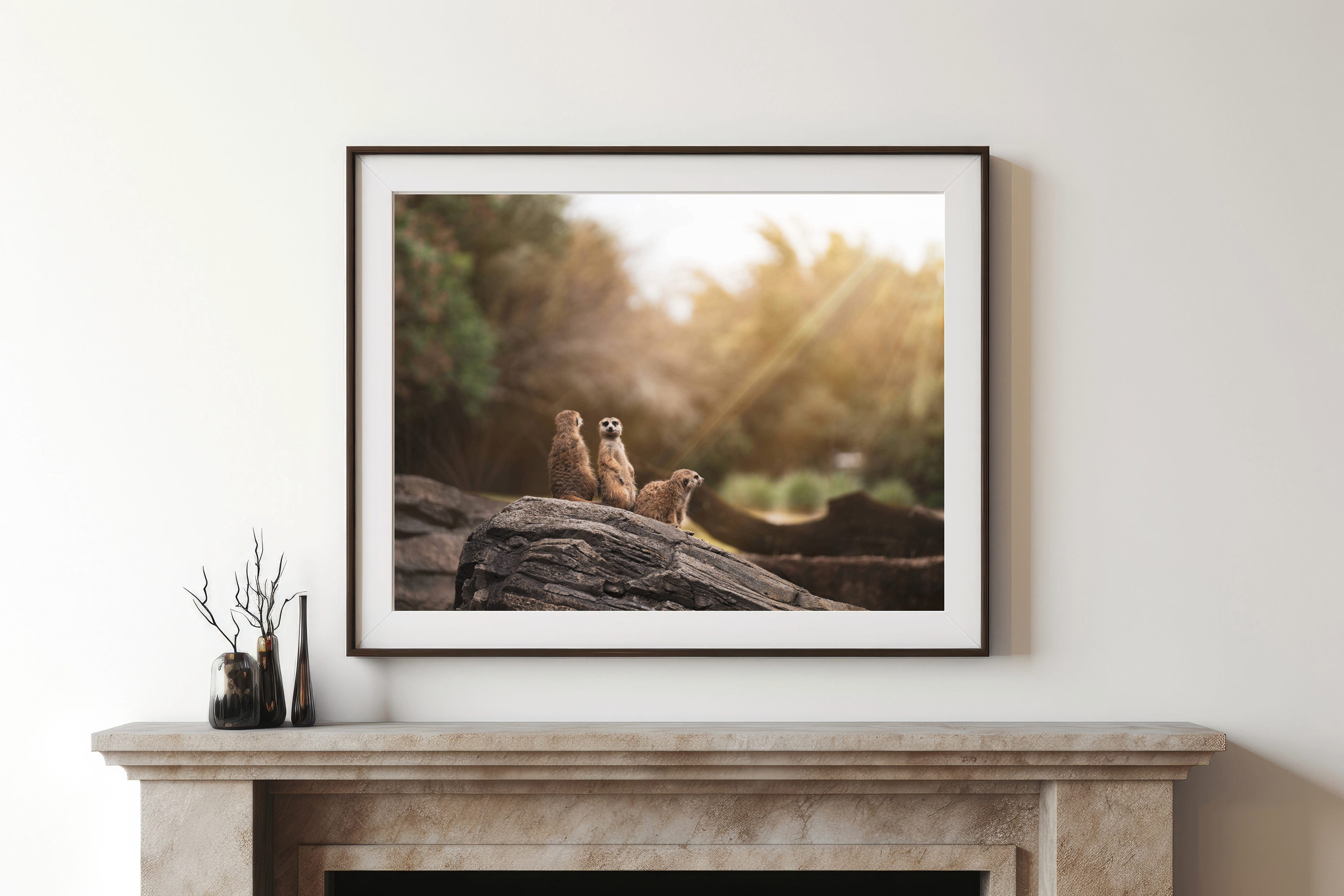 Fine art portrait of three Meerkats standing on a rock and keeping watch. One is looking at the camera, the other two are looking away and to the side. The bright afternoon sun is peaking through the side and flaring.